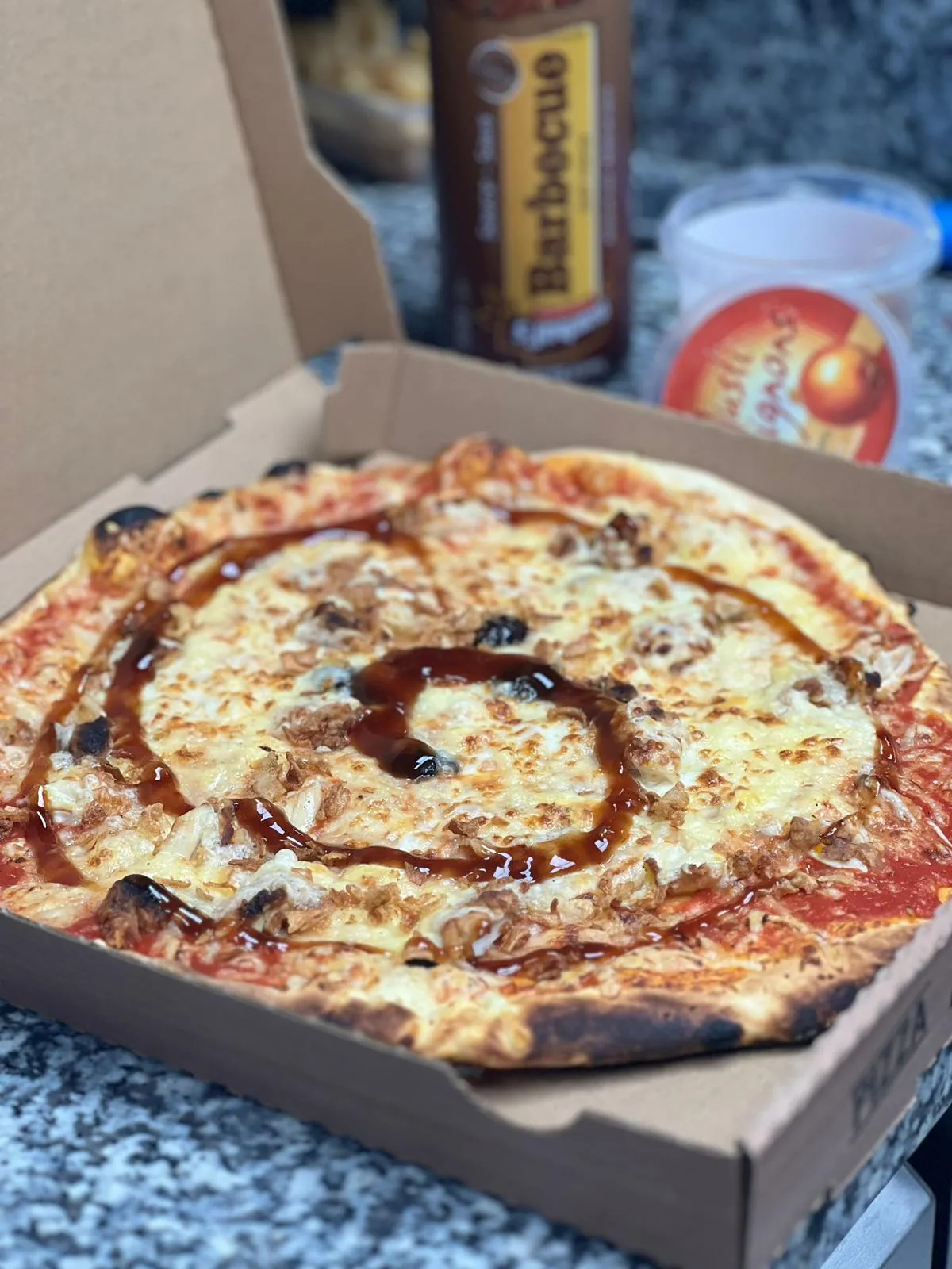 - Tomate, olives, tenders, crispy, mozzarella, emmental, sauce barbecue